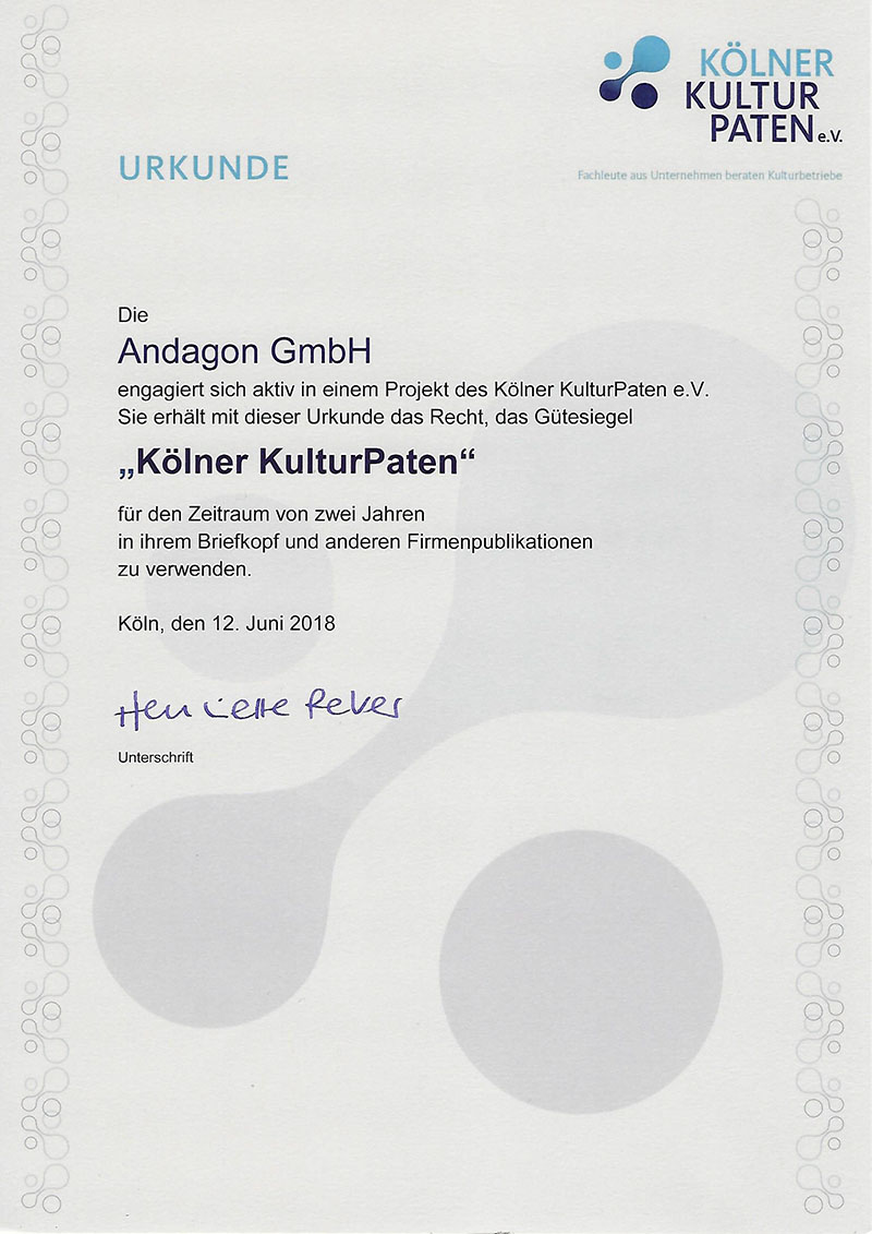 Auch im Rahmen des Kölner KulturPaten e.V. leisten wir unseren Beitrag, um mit sinnvoller „Hilfe zur Selbsthilfe“ möglichst dauerhaft die wirtschaftliche Existenz des Kölner Kulturbetriebs zu verbessern.